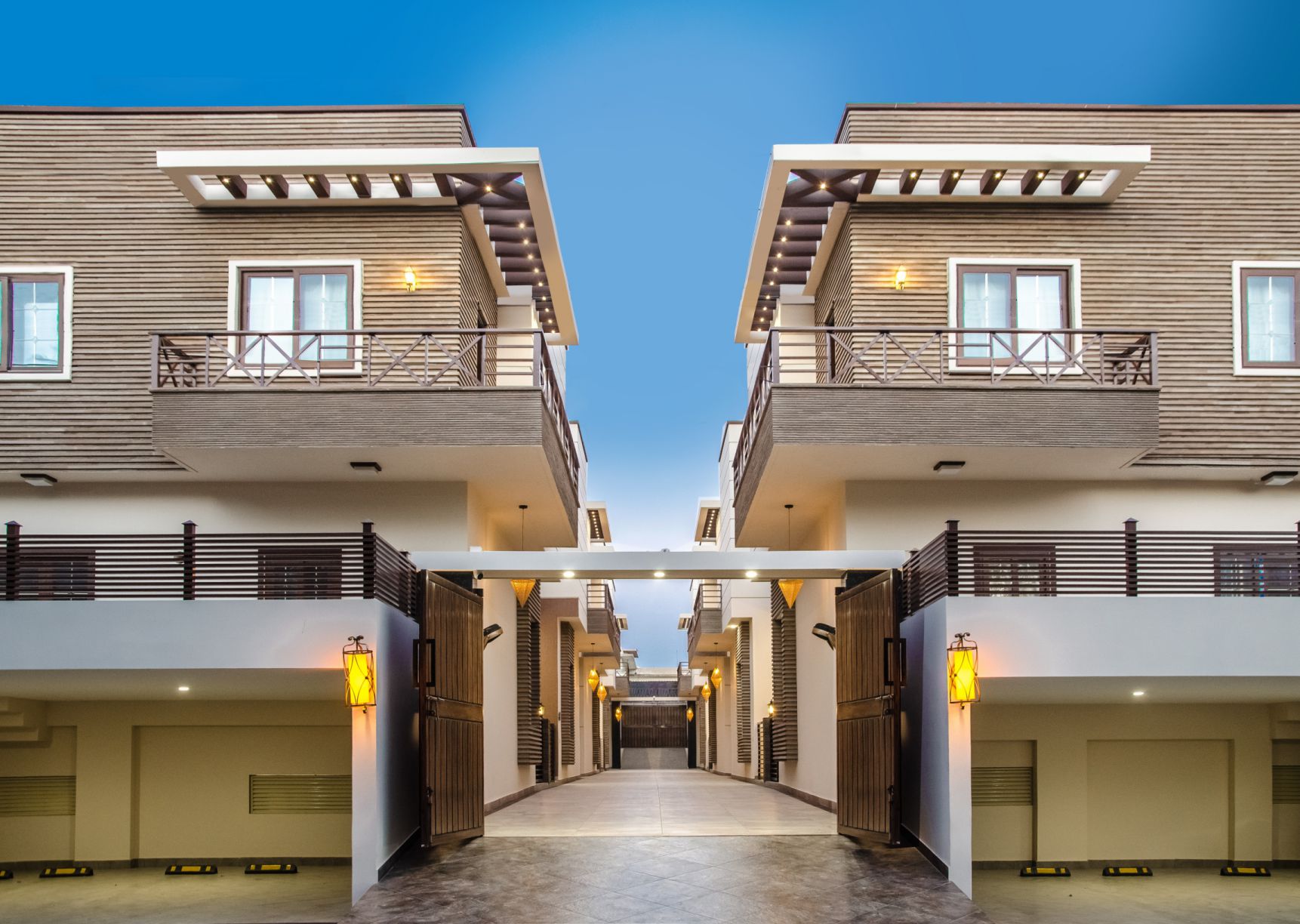 The development combines warm wooden textured panels with crisp white elements and dark accents, perfectly complemented by precisely engineered window and door systems. Each unit features carefully positioned windows maximizing natural light while ensuring privacy – crucial in multi-residential settings.