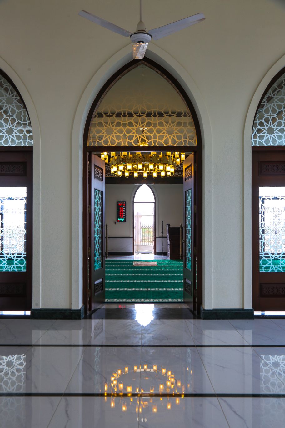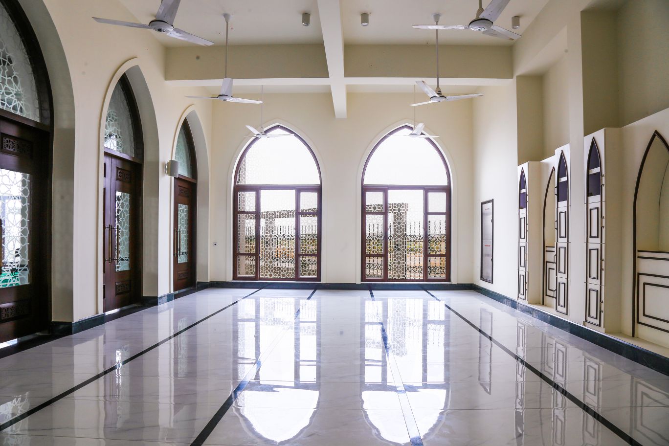 Inside, the prayer hall is bathed in filtered natural light through strategically placed windows with decorative geometric patterns creating beautiful light effects while maintaining privacy. These custom solutions showcase the ability to combine aesthetic considerations with practical functionality – crucial in religious architecture.