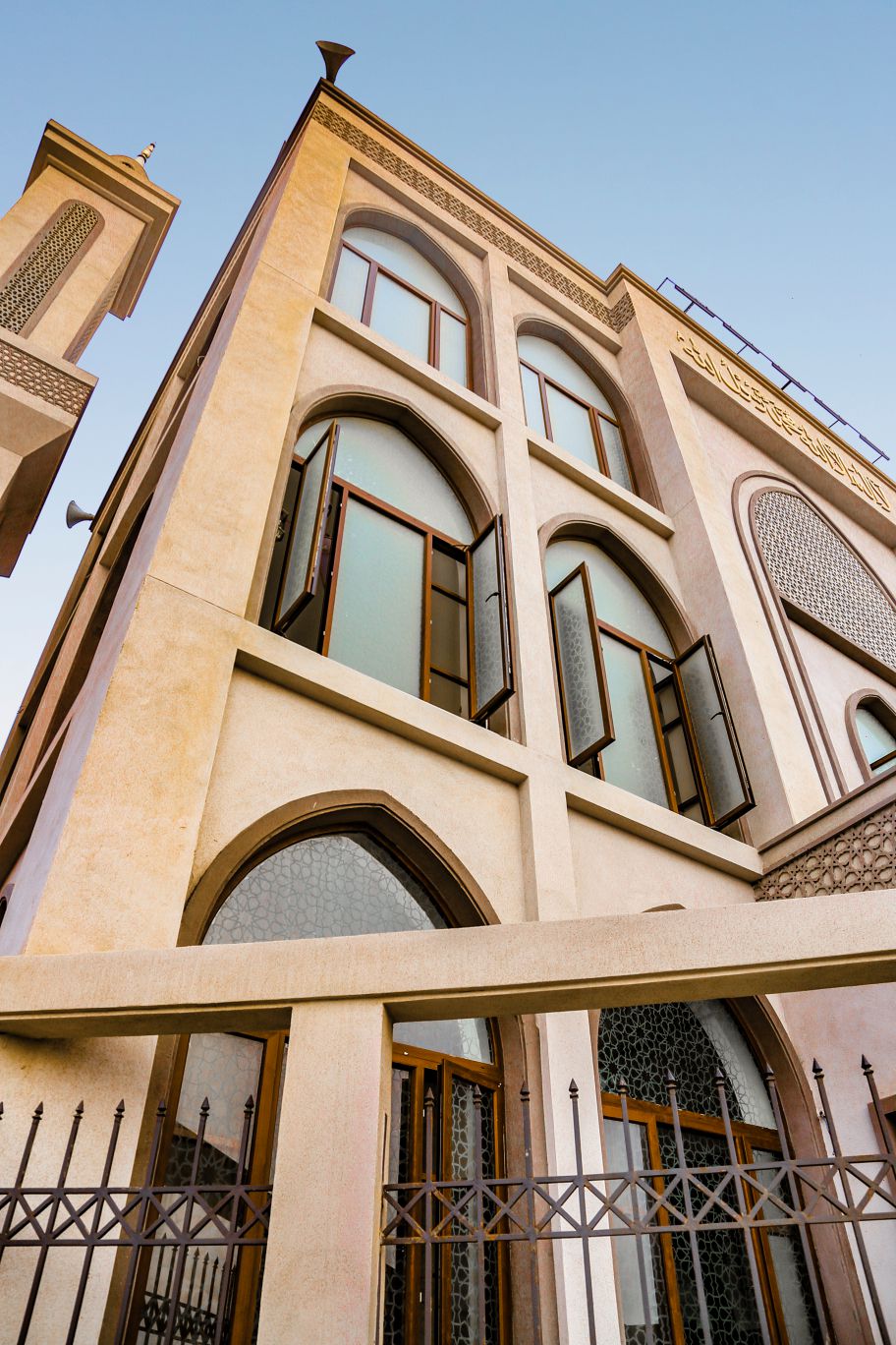 The structure features distinctive arched windows and doorways honoring classical Islamic design principles, with custom-crafted frames perfectly complementing the elegant white exterior. The precision engineering of these specialized window shapes demonstrates Unitherm’s technical expertise and commitment to preserving architectural heritage.
